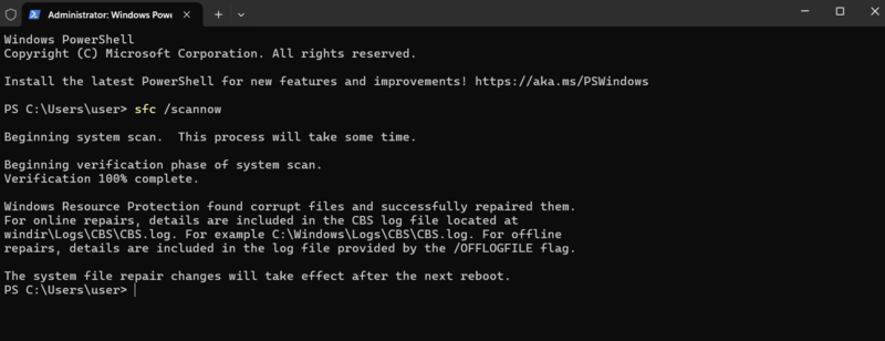 Run the command below to scan for and repair any missing or corrupted system files on your machine: