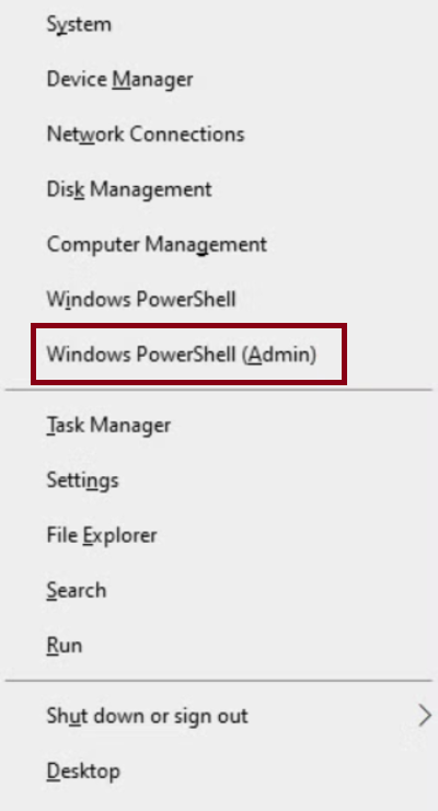 Press Windows + X, then select Command Prompt (Admin) or Windows PowerShell (Admin) from the menu.