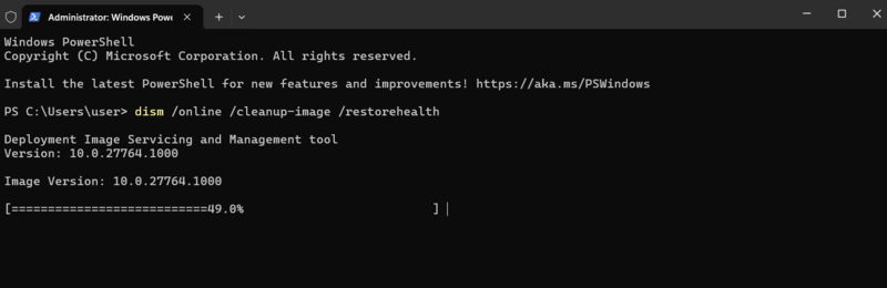 Tip: This process can take some time. Let the command complete fully to ensure your system is fixed. If it fails, you can try using an alternate source, like a Windows installation media.