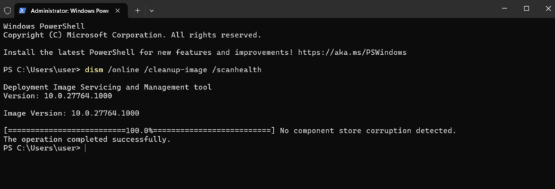 To identify any existing issues before proceeding with repairs, run the Windows dism command to scan your system for any corruption within the Windows image: